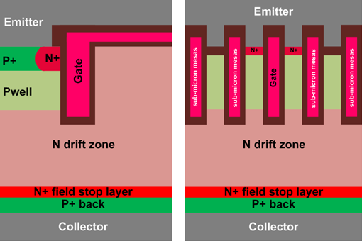 IGBT(Insulated Gate Bipolar Transistor,簡(jiǎn)寫IGBT)功率器件與VDMOS的差別在于n外延層下面不是n+層而是p+層。導(dǎo)通時(shí)在n型漂移區(qū)產(chǎn)生電導(dǎo)調(diào)制效應(yīng),大幅降低導(dǎo)通壓降。